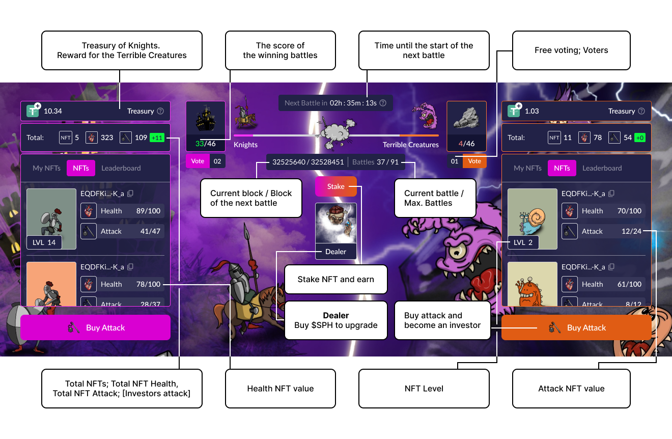 **The Old Castle Defense** is the fairest and most transparent play-to-earn (P2E) on-chain game, where **players** fight battles and sieges using their **Terrible Creatures** and **Knights of the Kingdom** NFTs and are rewarded with **$SPH** and **$USDT** tokens for victories. **Investors** are the third party of participants who can change the outcome of battles by investing in any of the teams, buying attacks, and saving NFTs from death. All funds from **investors** are going to the treasury of both **factions**.&#x20;